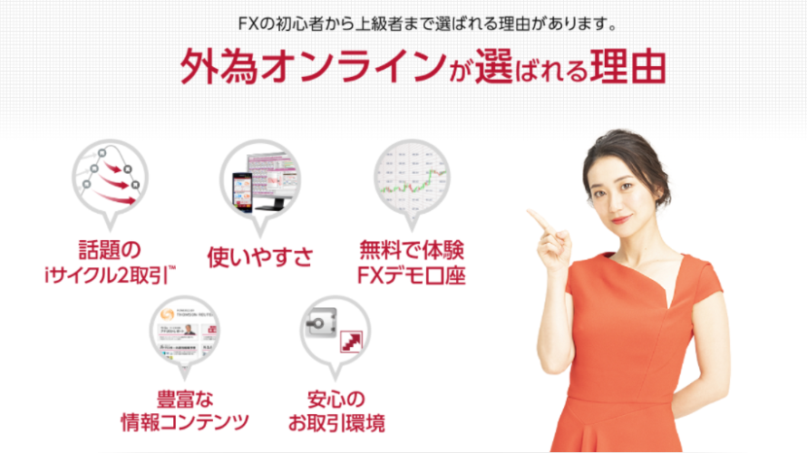 外為オンラインは、外国為替取引をインターネットを利用して提供するオンライン取引サービスです。主に個人投資家向けに、外国為替(FX)取引や外国株式投資、CFD取引(差金決済取引)などの金融商品を提供しております。取引の手数料が安く、スピーディーな取引が可能であることから、多くの投資家に支持されています。